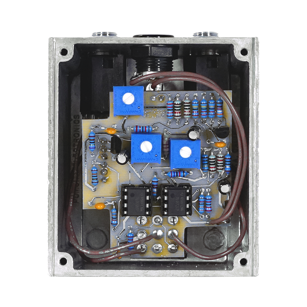 そして完成したのがChoad Blasterです。その回路には、ユニークなゲインストラクチャーが組み込まれ、マイルドなオーバードライブからヘヴィなディストーションまで、たった2つのノブで実現してしまったのです。そのノブは、ローエンドからローミッドまでの歪みと、ハイミッドのクランチを調整するものでした。そのペダルを販売してみると大変に好評で、ファズとディストーションの間のペダルとして、また多くの歪み系の中でも特にオープンなサウンドが得られるペダルとして評価されました。