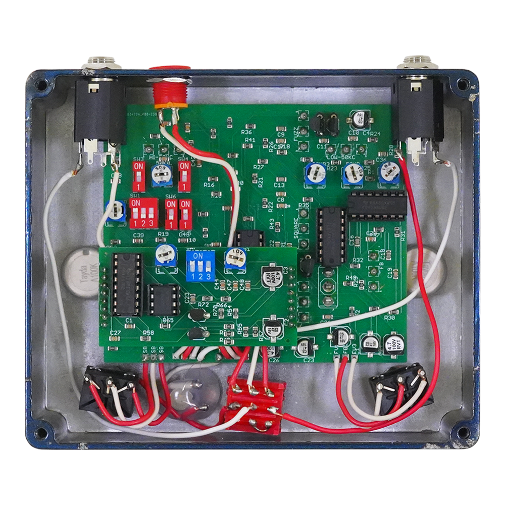 SyntheticノブはCMOSを使用したロジックベースのファズで、ベルクロファズやシンセ、ゲート、グリッチトーンを表現します。Pristineノブを使えば、クレイジーなトーンにクリーントーンをミックスして音色をバランスさせます。Overloadノブは内部フィードバックループへのシグナルレベルで、ファズの出力がフィードバックして発振や危険なトーンを生み出します。Overloadノブの下にあるフットスイッチでフィードバックループのモメンタリON/OFFが可能です。トグルスイッチでフィードバックループを常時ONにすることもできます。