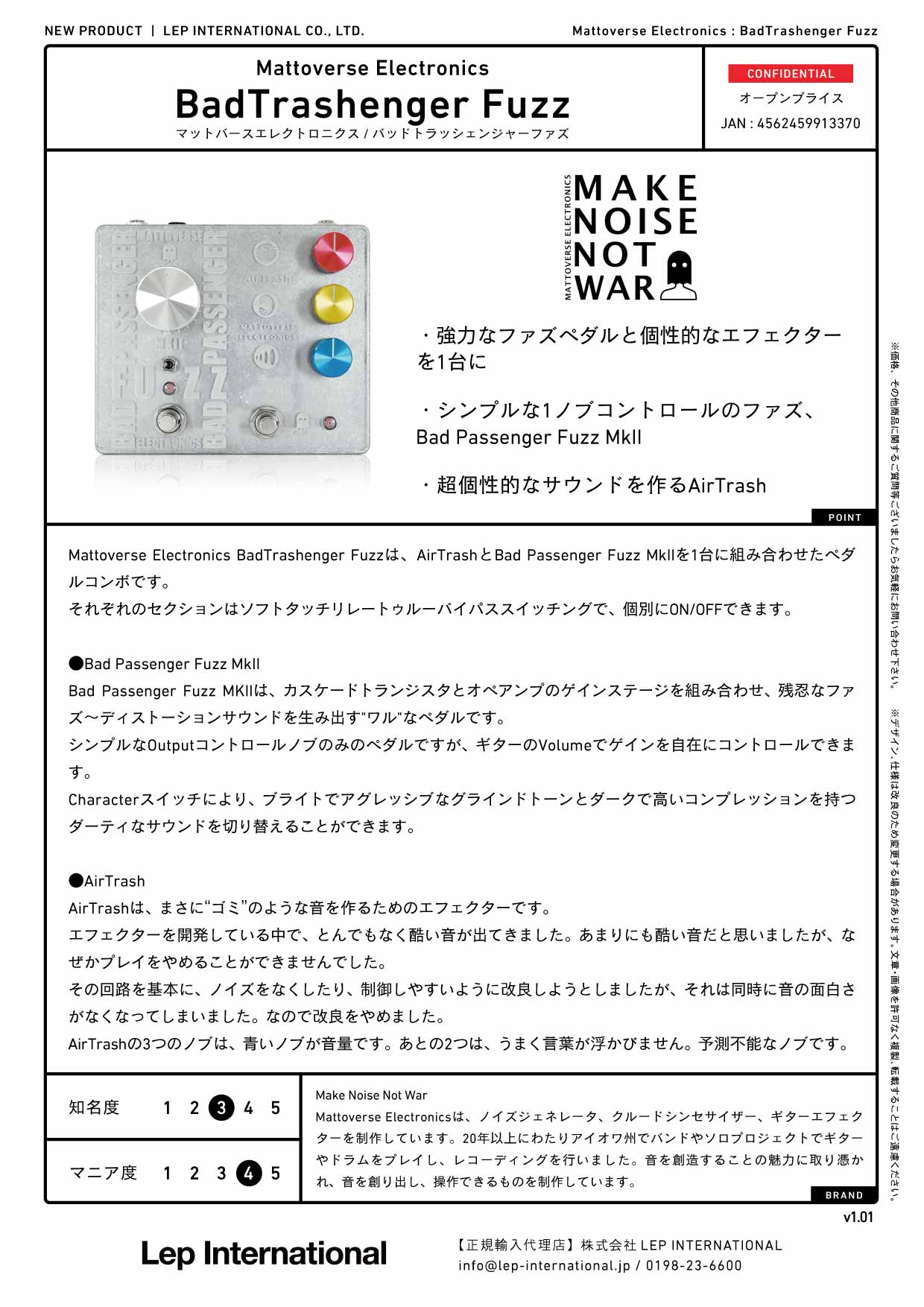 Mattoverse Electronics BadTrashenger Fuzzは、AirTrashとBad Passenger Fuzz MkIIを1台に組み合わせたペダルコンボです。