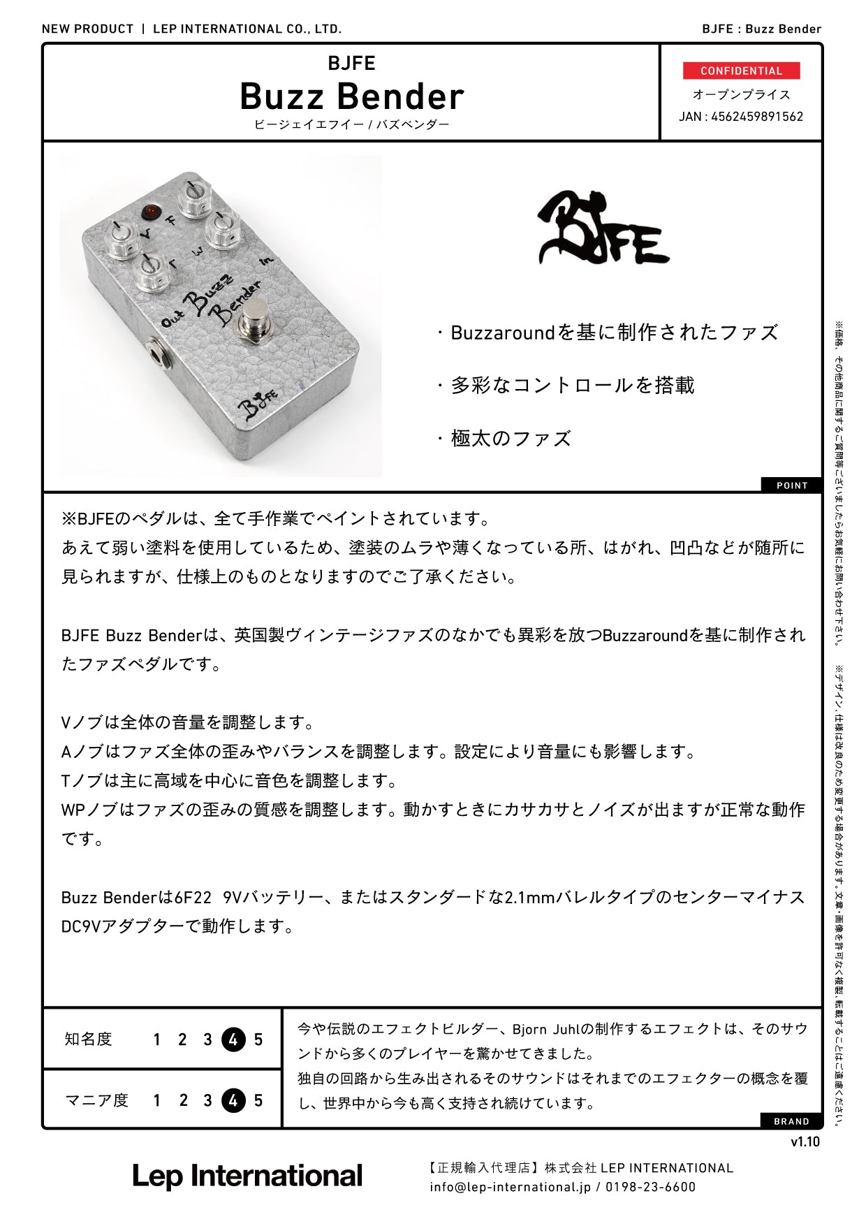 BJFE Buzz Benderは、英国製ヴィンテージファズのなかでも異彩を放つBuzzaroundを基に制作されたファズペダルです。