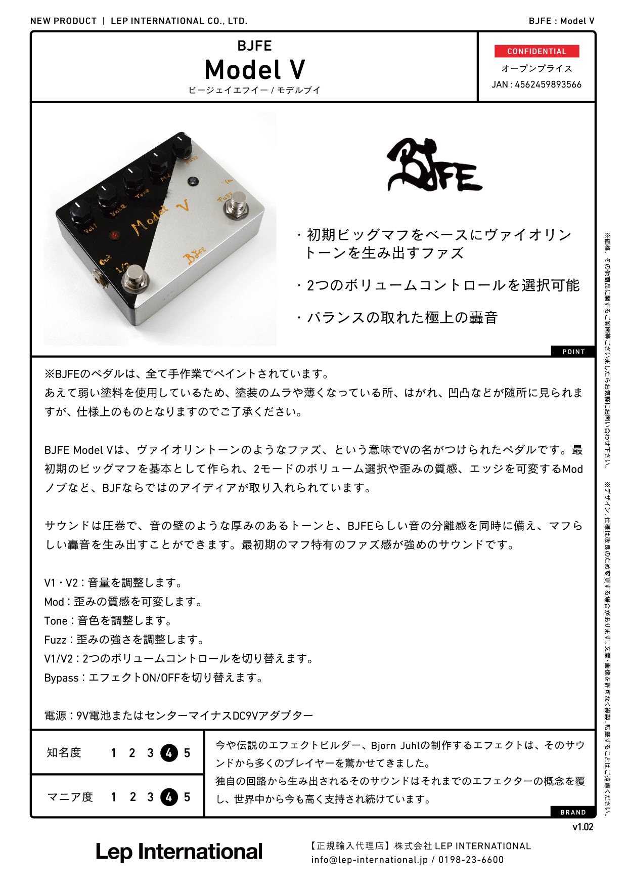 BJFE Model Vは、ヴァイオリントーンのようなファズ、という意味でVの名がつけられたペダルです。