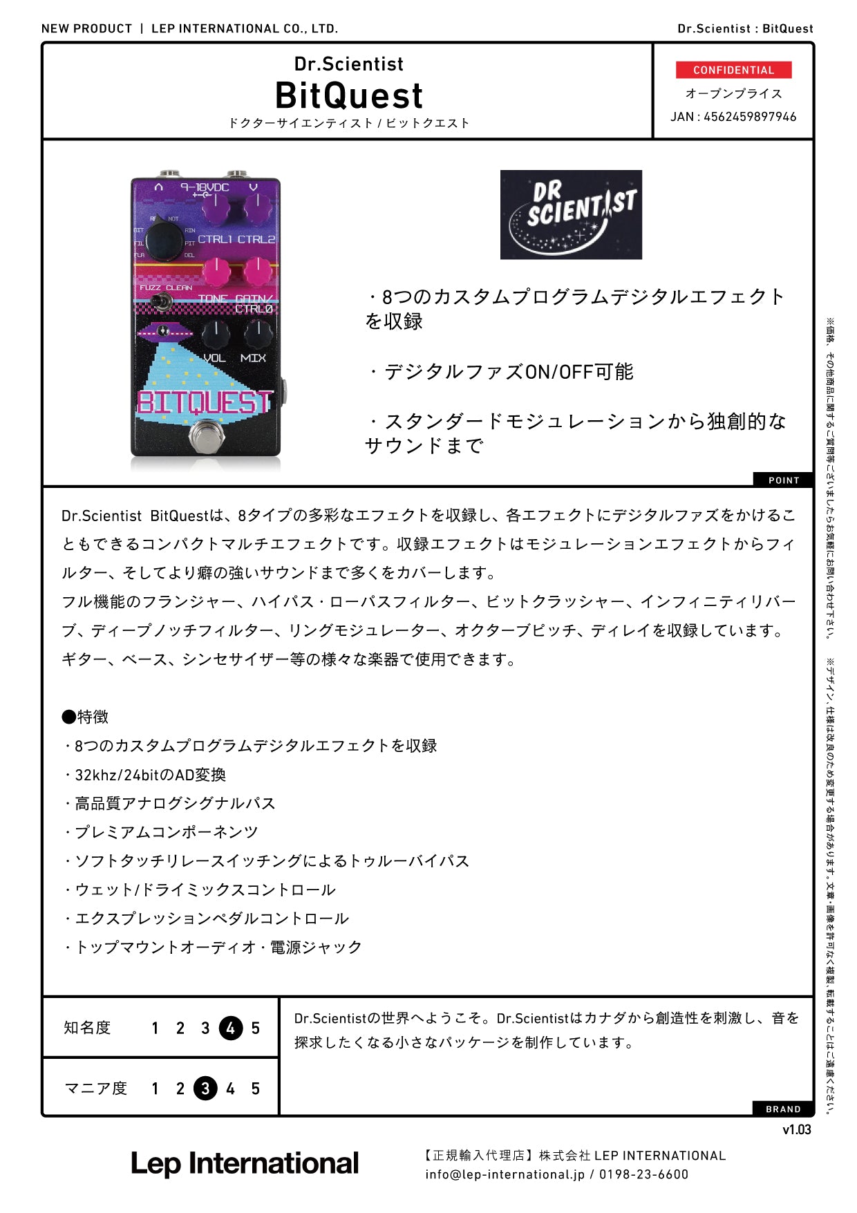 Dr.Scientist BitQuestは、8タイプの多彩なエフェクトを収録し、各エフェクトにデジタルファズをかけることもできるコンパクトマルチエフェクトです。収録エフェクトはモジュレーションエフェクトからフィルター、そしてより癖の強いサウンドまで多くをカバーします。