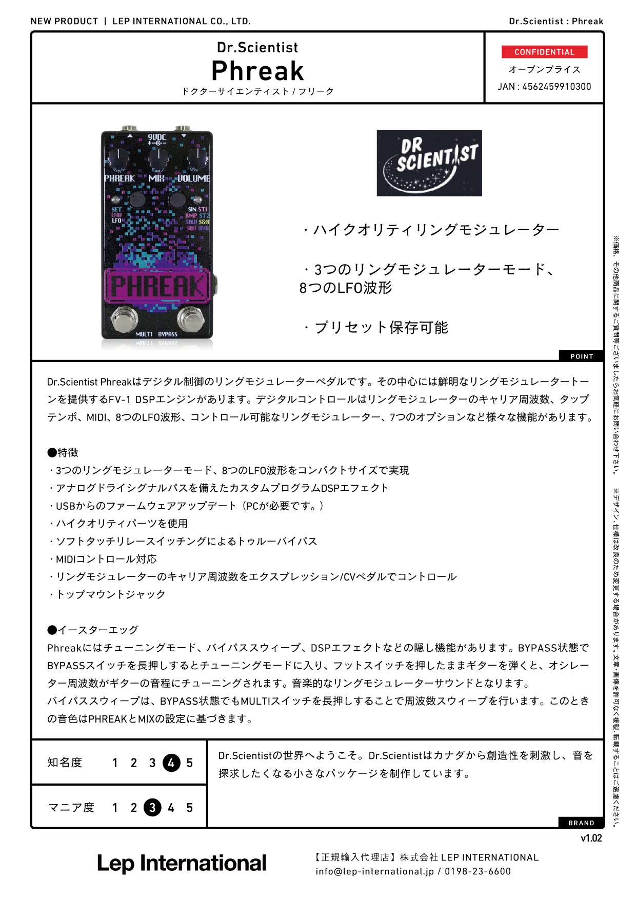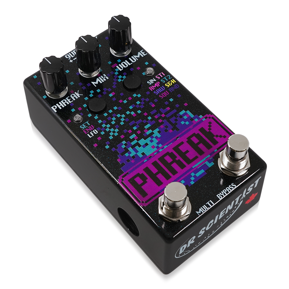 Dr.Scientist Phreakはデジタル制御のリングモジュレーターペダルです。その中心には鮮明なリングモジュレータートーンを提供するFV-1 DSPエンジンがあります。デジタルコントロールはリングモジュレーターのキャリア周波数、タップテンポ、MIDI、8つのLFO波形、コントロール可能なリングモジュレーター、7つのオプションなど様々な機能があります。