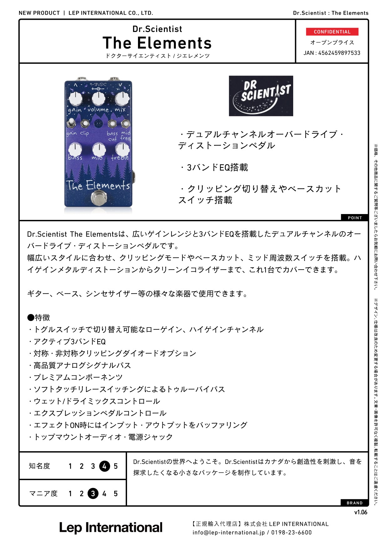 Dr. Scientist The Elementsは、広いゲインレンジと3バンドEQを搭載したデュアルチャンネルのオーバードライブ・ディストーションペダルです。