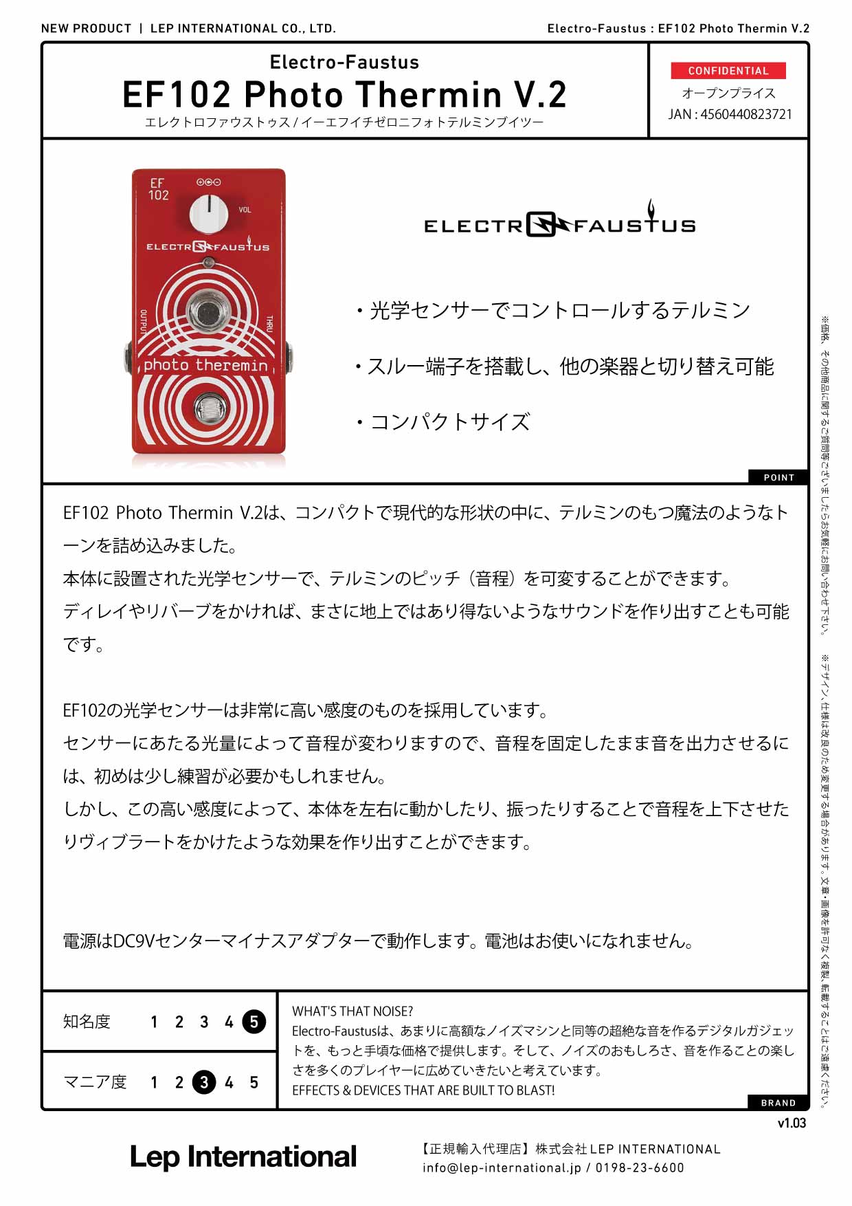 EF102 Photo Thermin V.2は、コンパクトで現代的な形状の中に、テルミンのもつ魔法のようなトーンを詰め込みました。