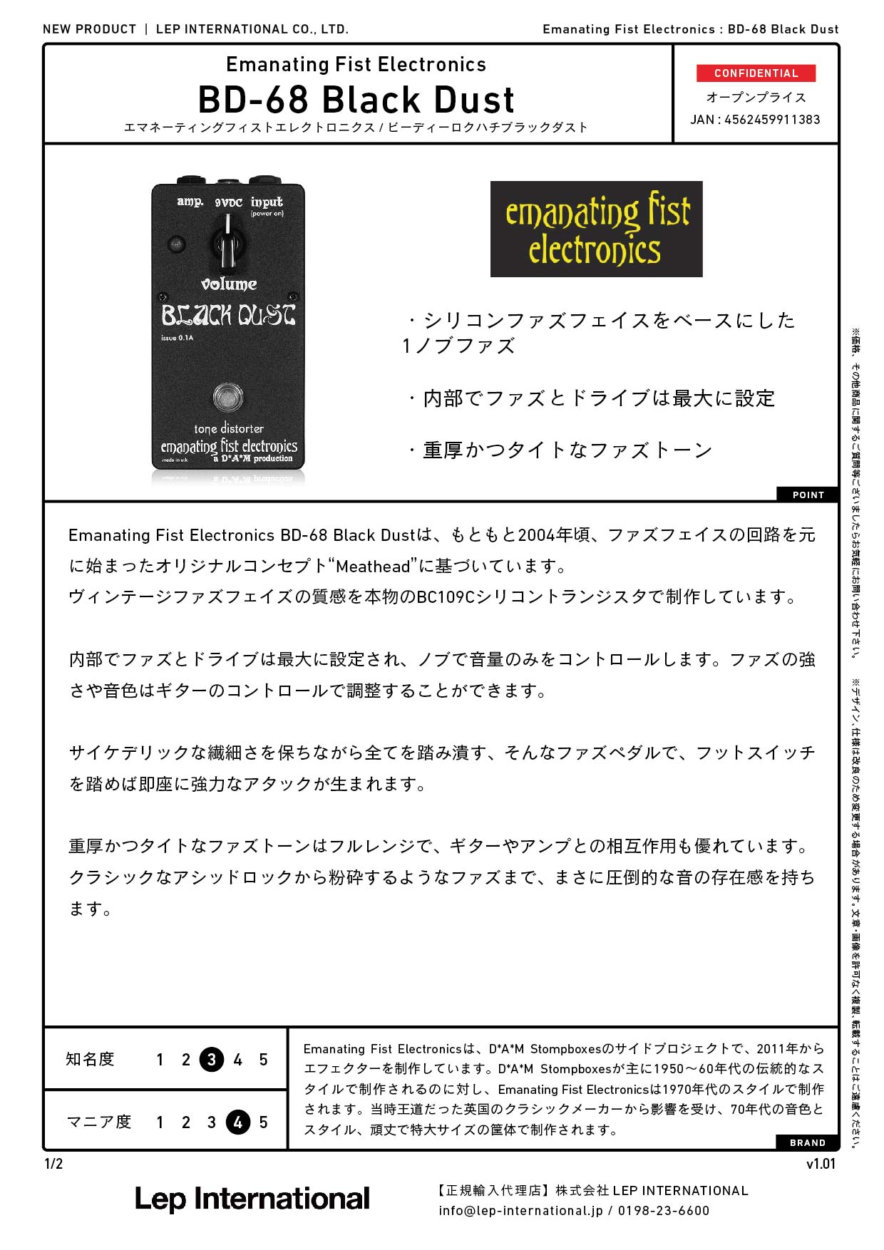 Emanating Fist Electronics BD-68 Black Dustは、もともと2004年頃、ファズフェイスの回路を元に始まったオリジナルコンセプト“Meathead”に基づいています。