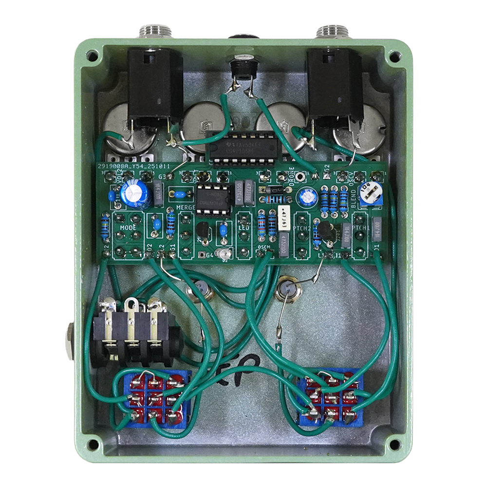 コントロール:Oscillator VOLUME、Oscillator PITCH、Oscillator VOLTAGE、drive VOLUME、pitch I、Potch II、LED、merge、distortion/boost/drive