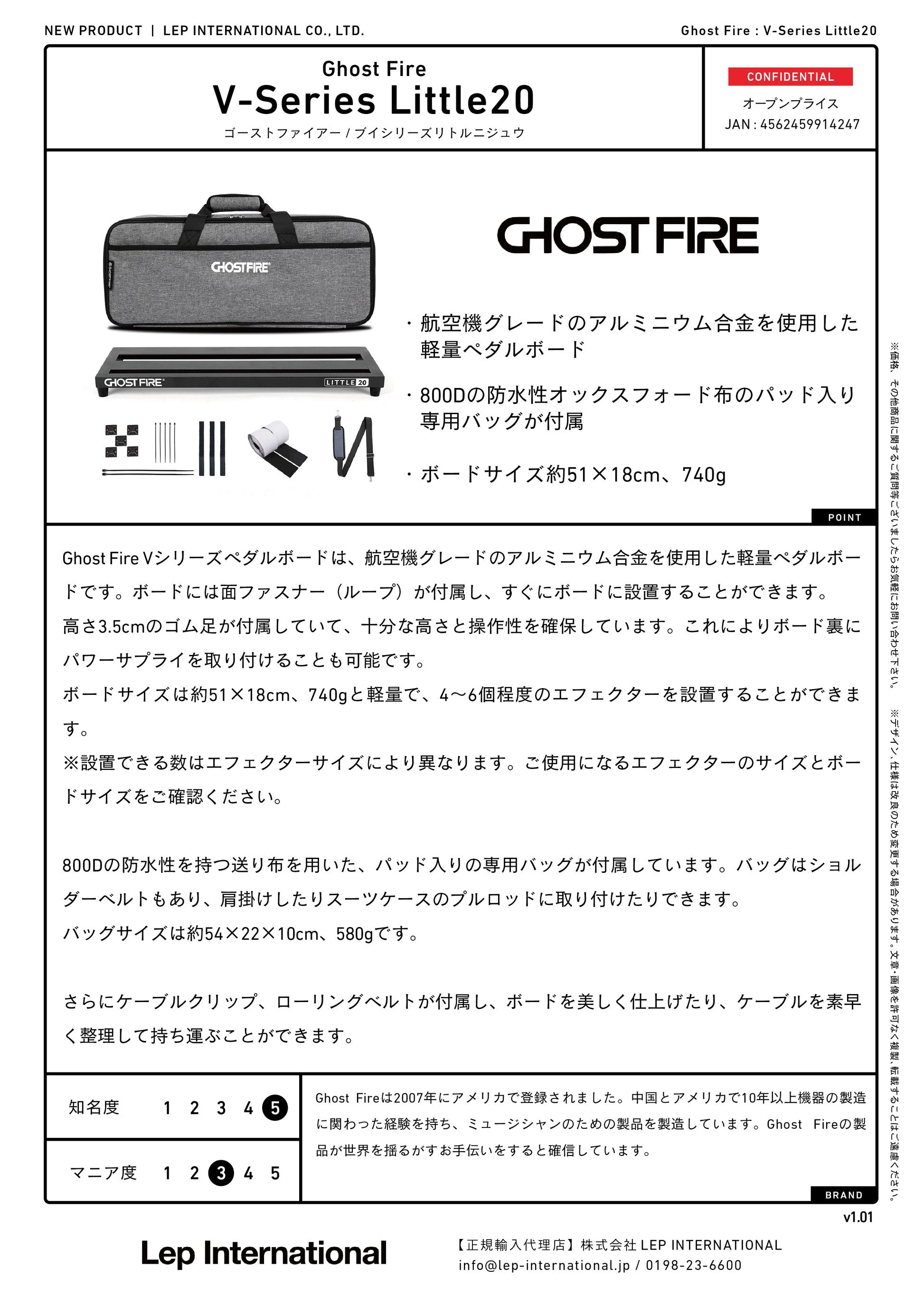 Ghost Fire Vシリーズペダルボードは、航空機グレードのアルミニウム合金を使用した軽量ペダルボードです。ボードには面ファスナー(ループ)が付属し、すぐにボードに設置することができます。