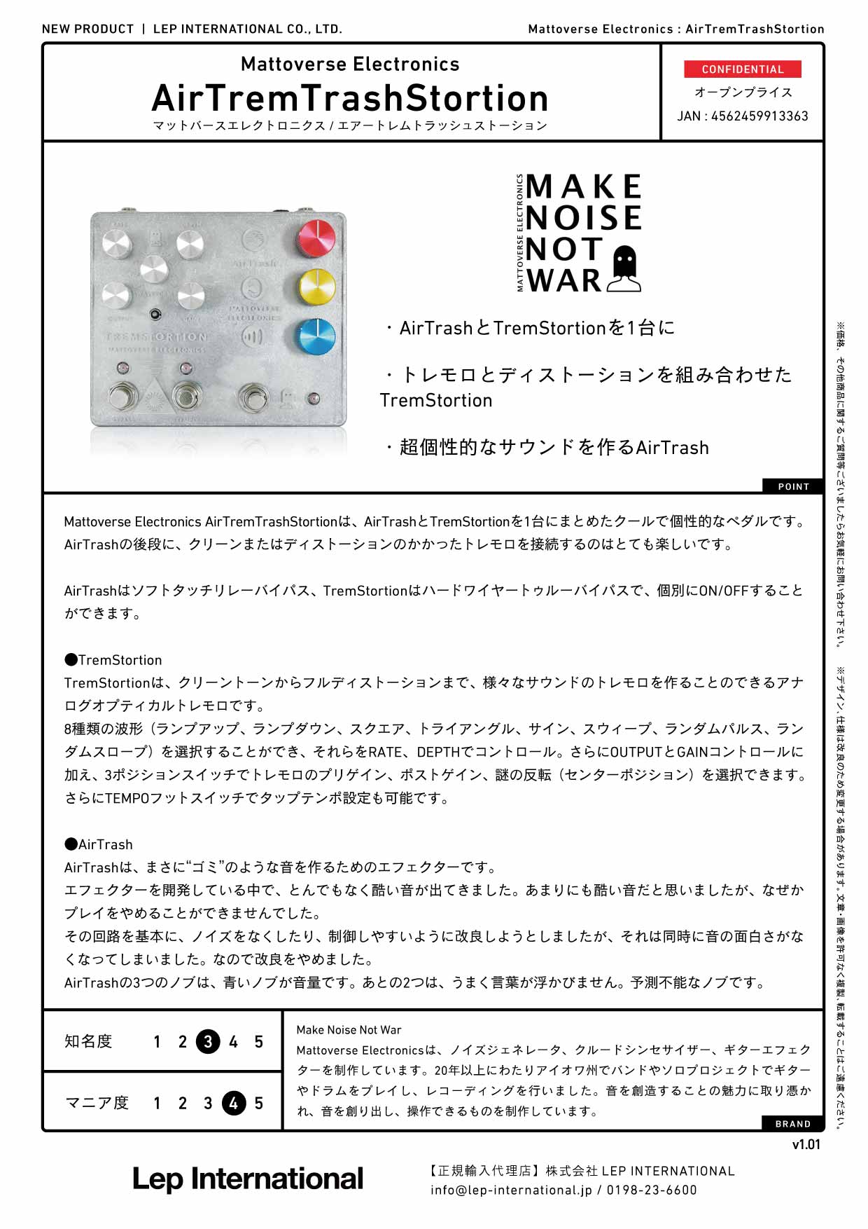 Mattoverse Electronics AirTremTrashStortionは、AirTrashとTremStortionを1台にまとめたクールで個性的なペダルです。
