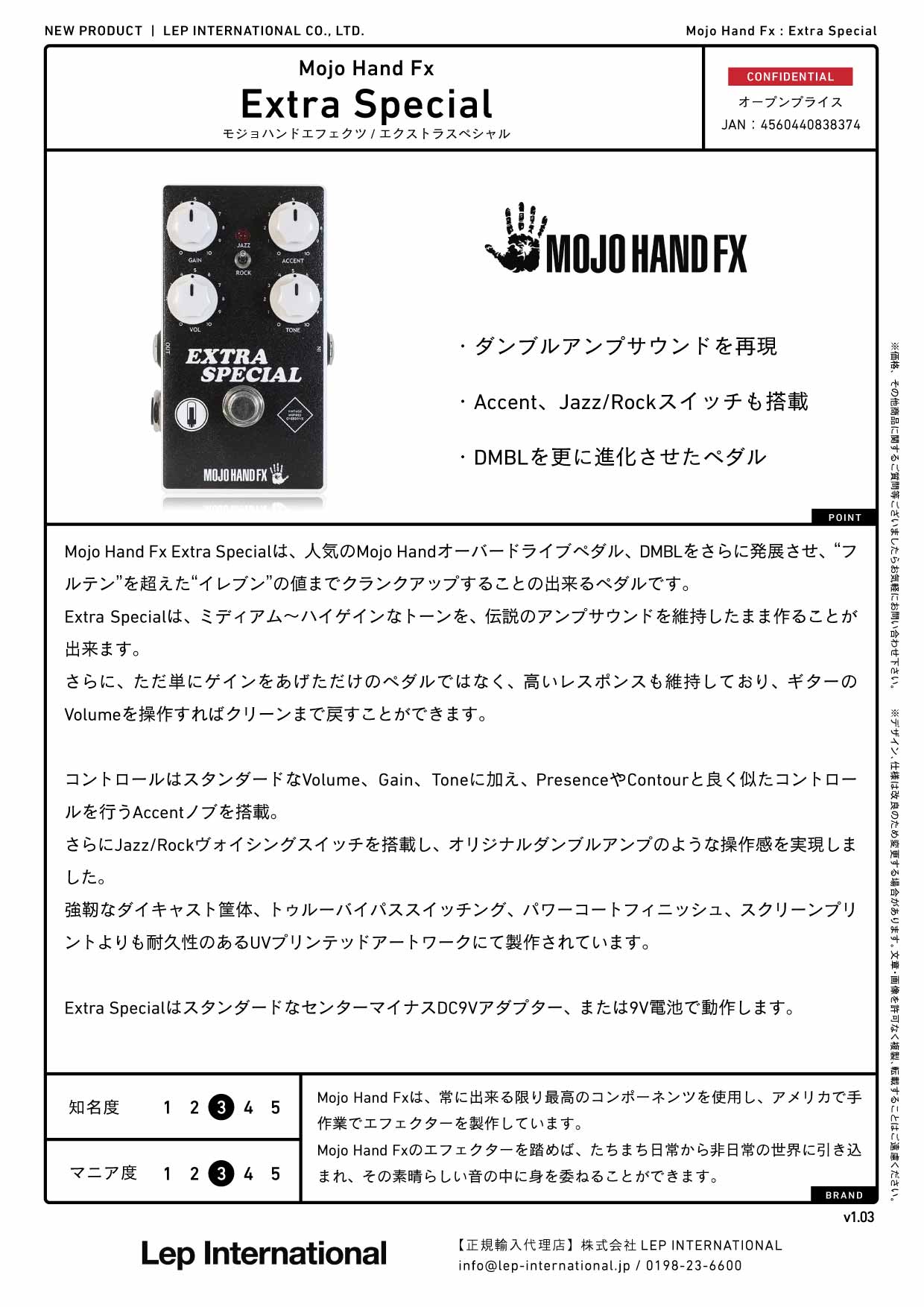 Mojo Hand Fx Extra Specialは、人気のMojo Handオーバードライブペダル、DMBLをさらに発展させ、“フルテン”を超えた“イレブン”の値までクランクアップすることの出来るペダルです。