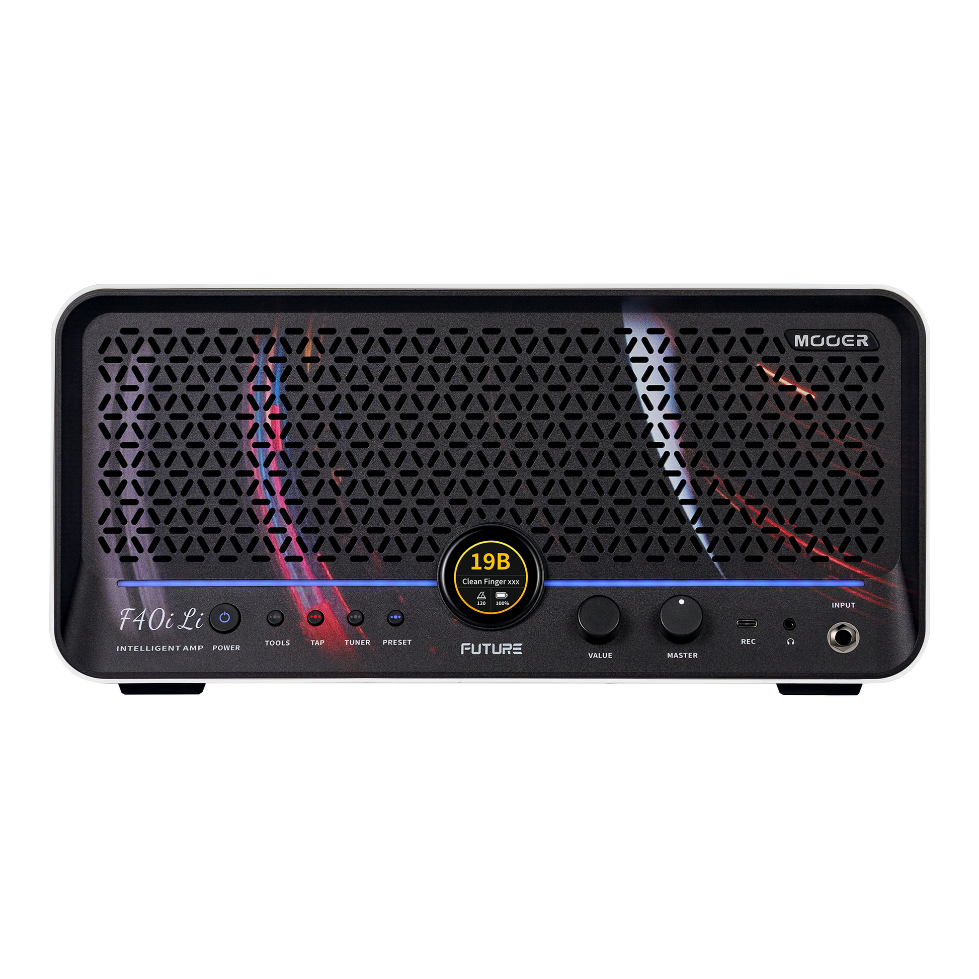 Mooer F40i Liは、多彩なアンプモデルとエフェクトを組み合わせたトーンをアプリから設定して操作できるデスクトップアンプです。本体にタッチスクリーンを備え、快適な操作が可能。